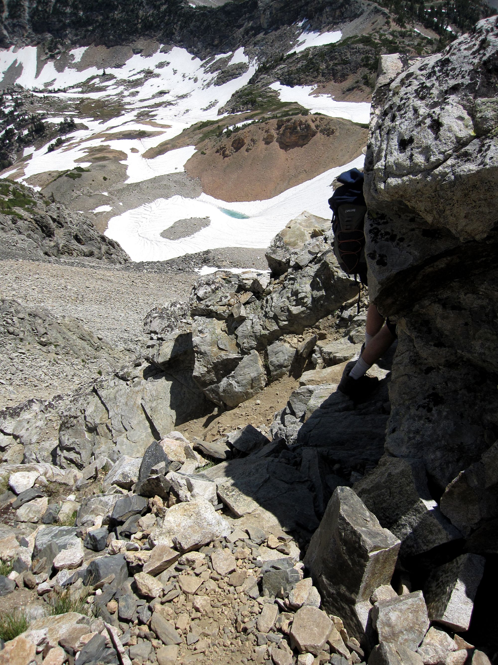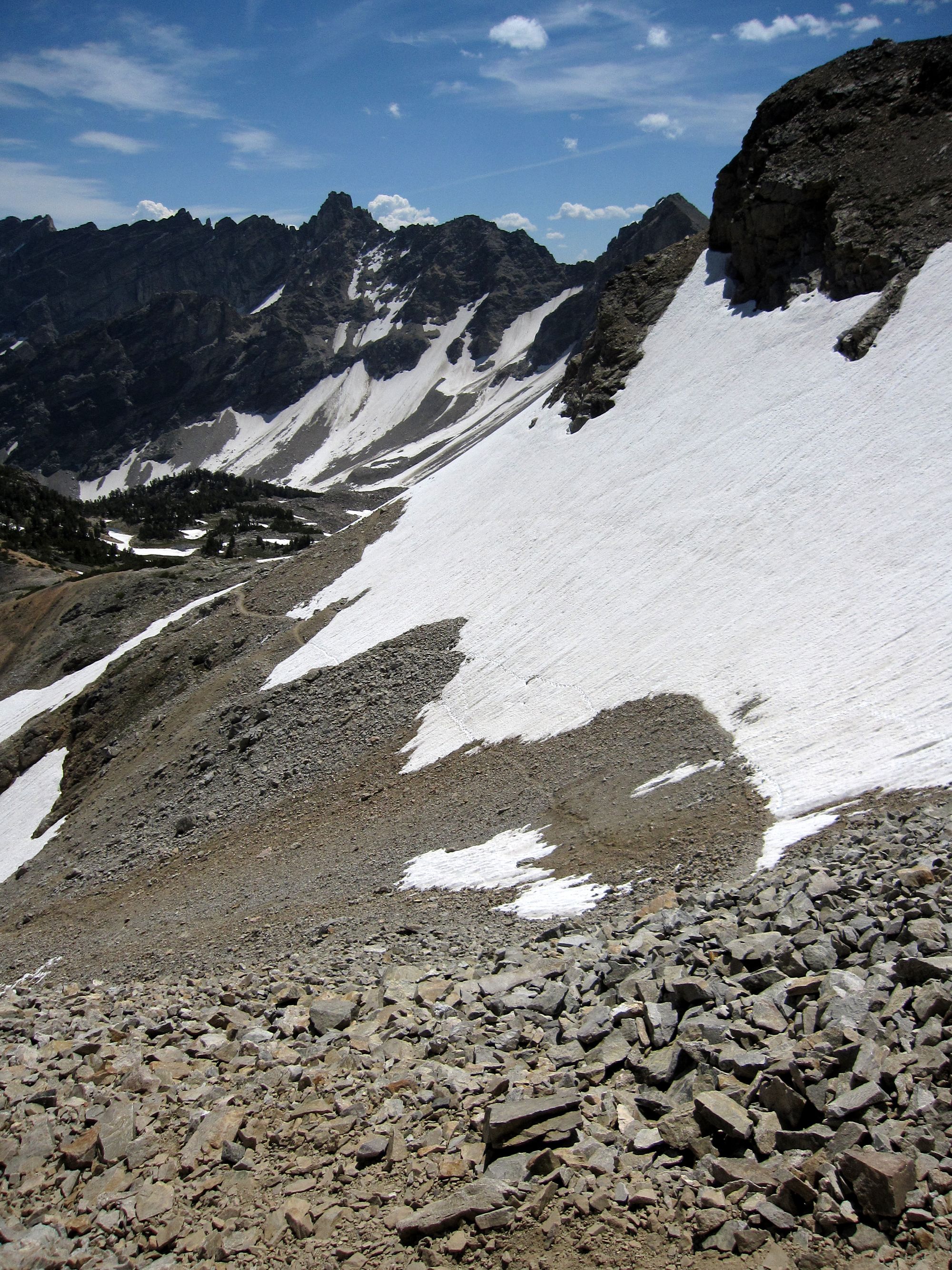 The trail, rocky and partially covered in snow (remember that this is in late July), in Paintbrush Canyon