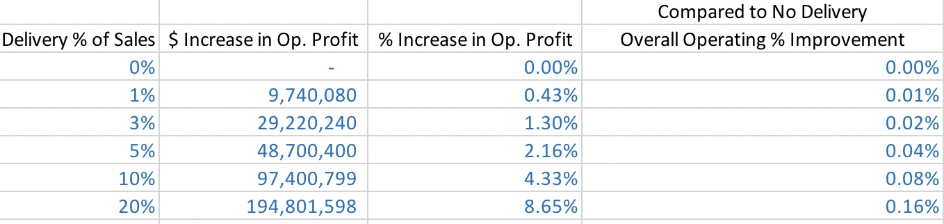 Said another way, under this model, every 1% shift to delivery of overall sales will result in: